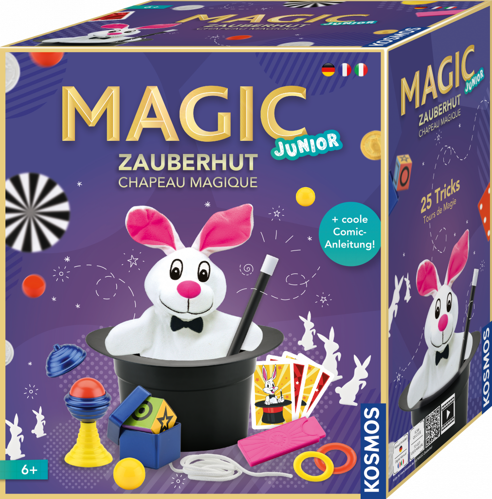 Der Zauberkasten „Magic Zauberhut“ eröffnet Kindern ab 6 Jahren eine fantasievolle Welt voller Magie und Illusion. Mit 25 verblüffenden Tricks, die in 3 Schwierigkeitsstufen unterteilt sind, gelingt es auch Einsteigern, spektakuläre Auftritte hinzulegen.