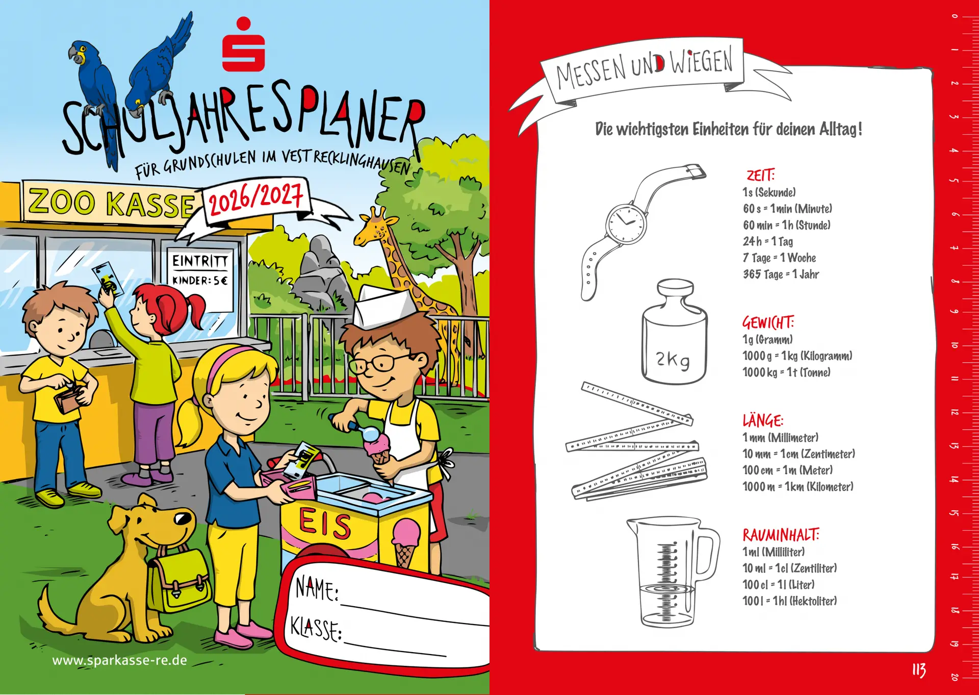 Neben den organ­isatorischen Funk­tio­nen enthält der Plan­er auch kindgerechte Lern­in­halte – in der kom­menden Aus­gabe zu finanzieller Bil­dung – sowie prak­tis­che Lern­hil­fen wie Hun­dert­er­feld, Messen und Wiegen. So verbindet er Struk­tur im Schu­lall­t­ag mit kleinen Lern­im­pulsen.